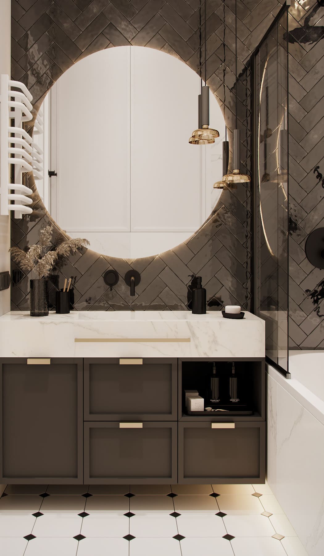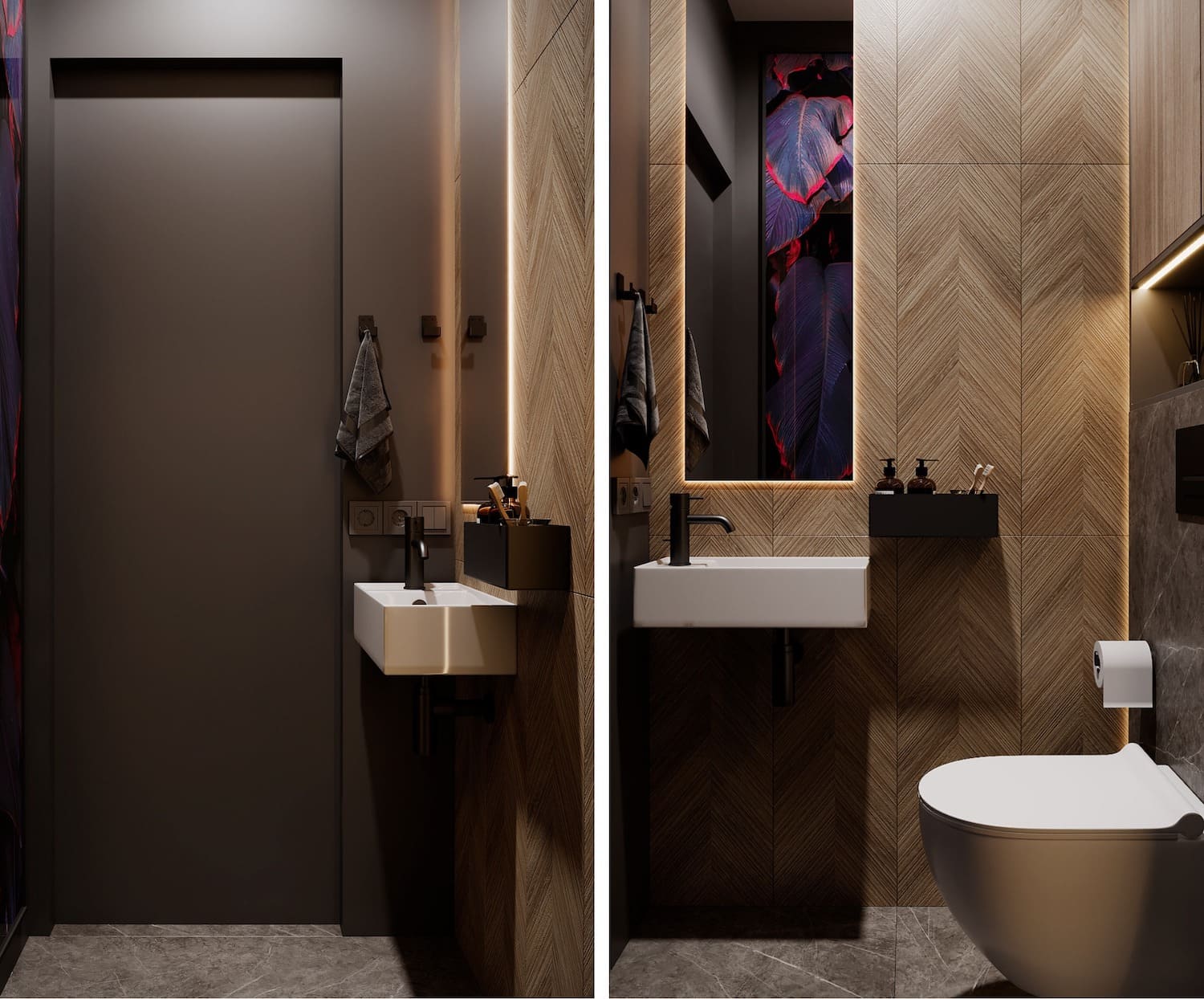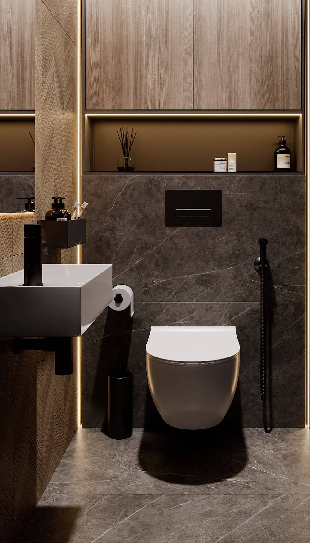 Дизайн ванной комнаты площадью 5 кв. м в темных тонах