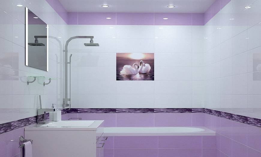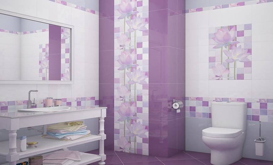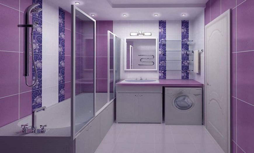 Эта палитра считается женской, особенно когда выбраны лиловые и пурпурные оттенки. А если включить в оформление розовые тона, то ванная будет напоминать помещение для юной принцессы.