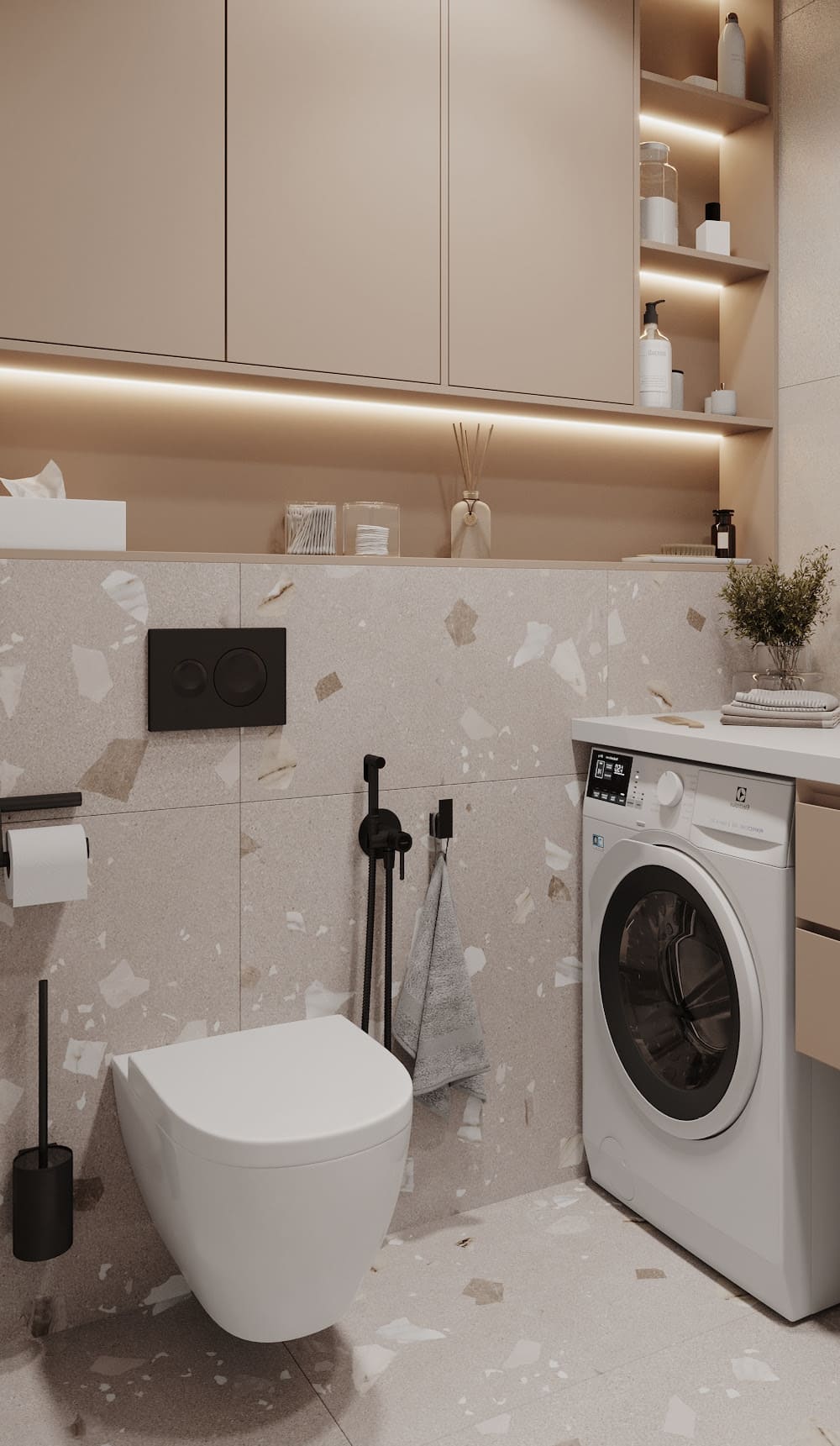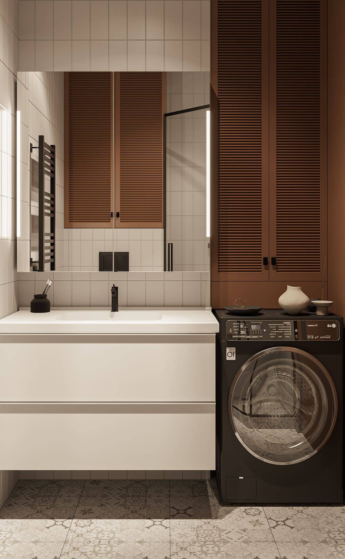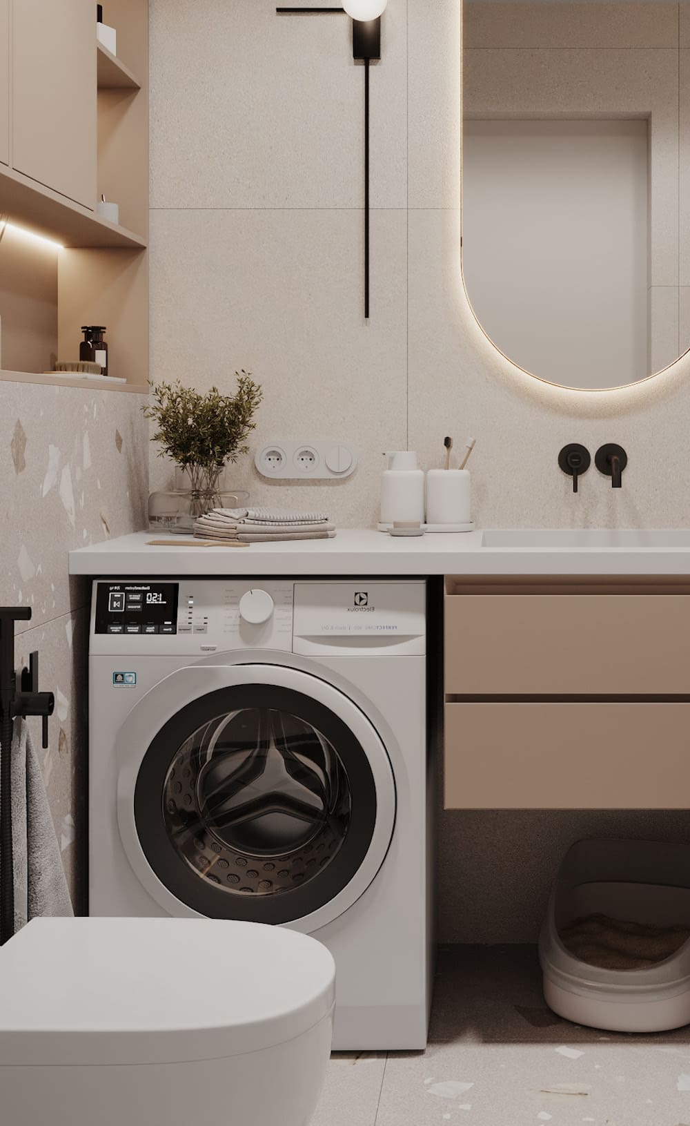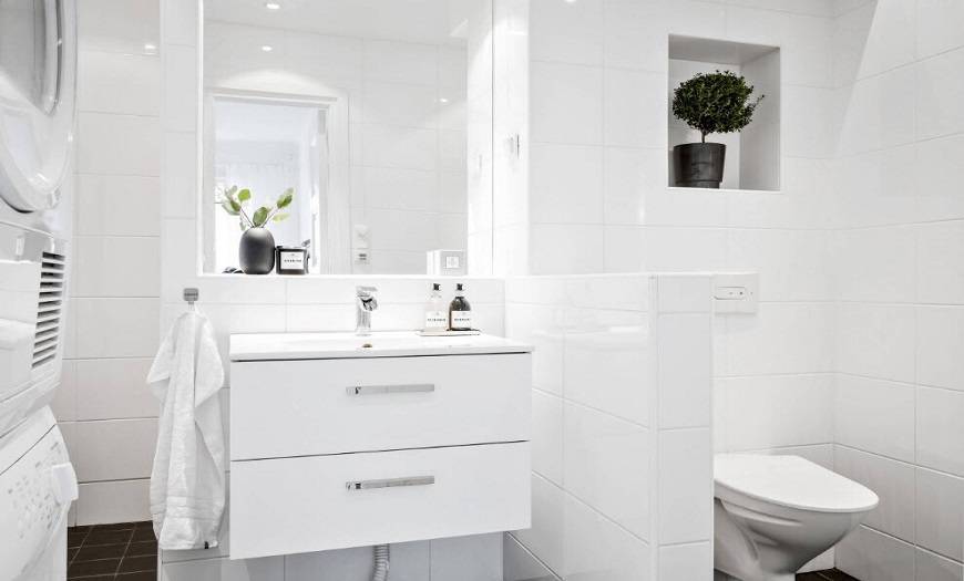 В небольшом помещении должно остаться место под стиральную машинку. Чтобы сэкономить пространство, можно установить оборудование под подвесной раковиной. Это отличное решение для помещений, которые не могут похвастаться большими размерами.