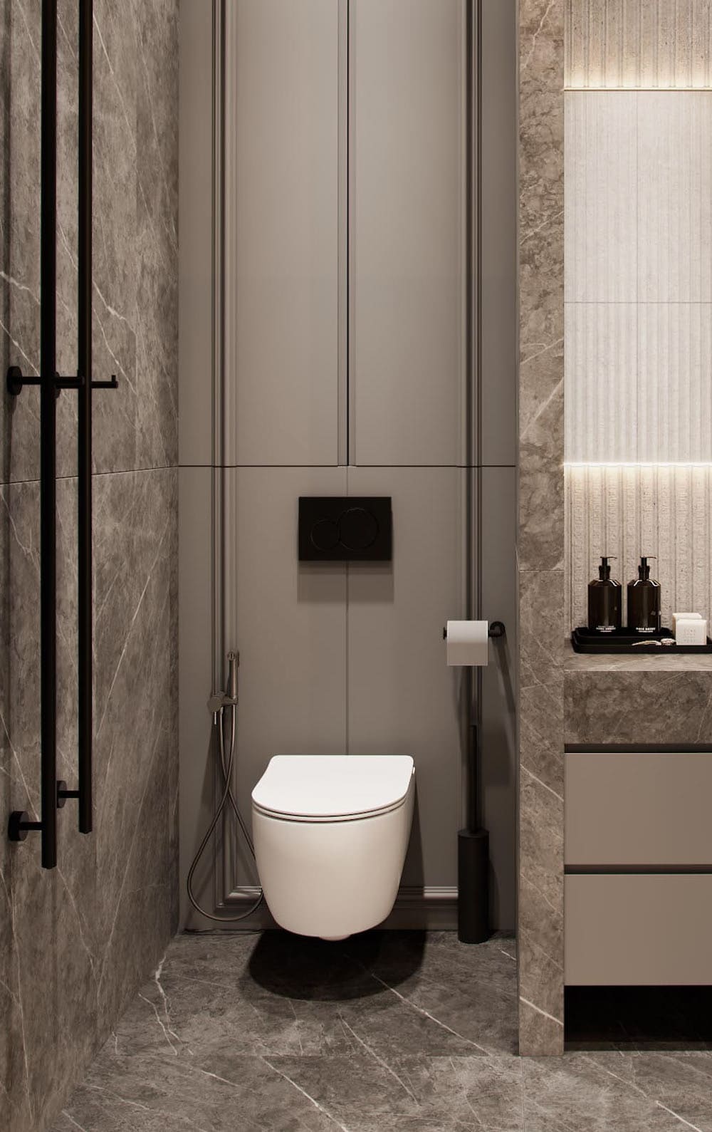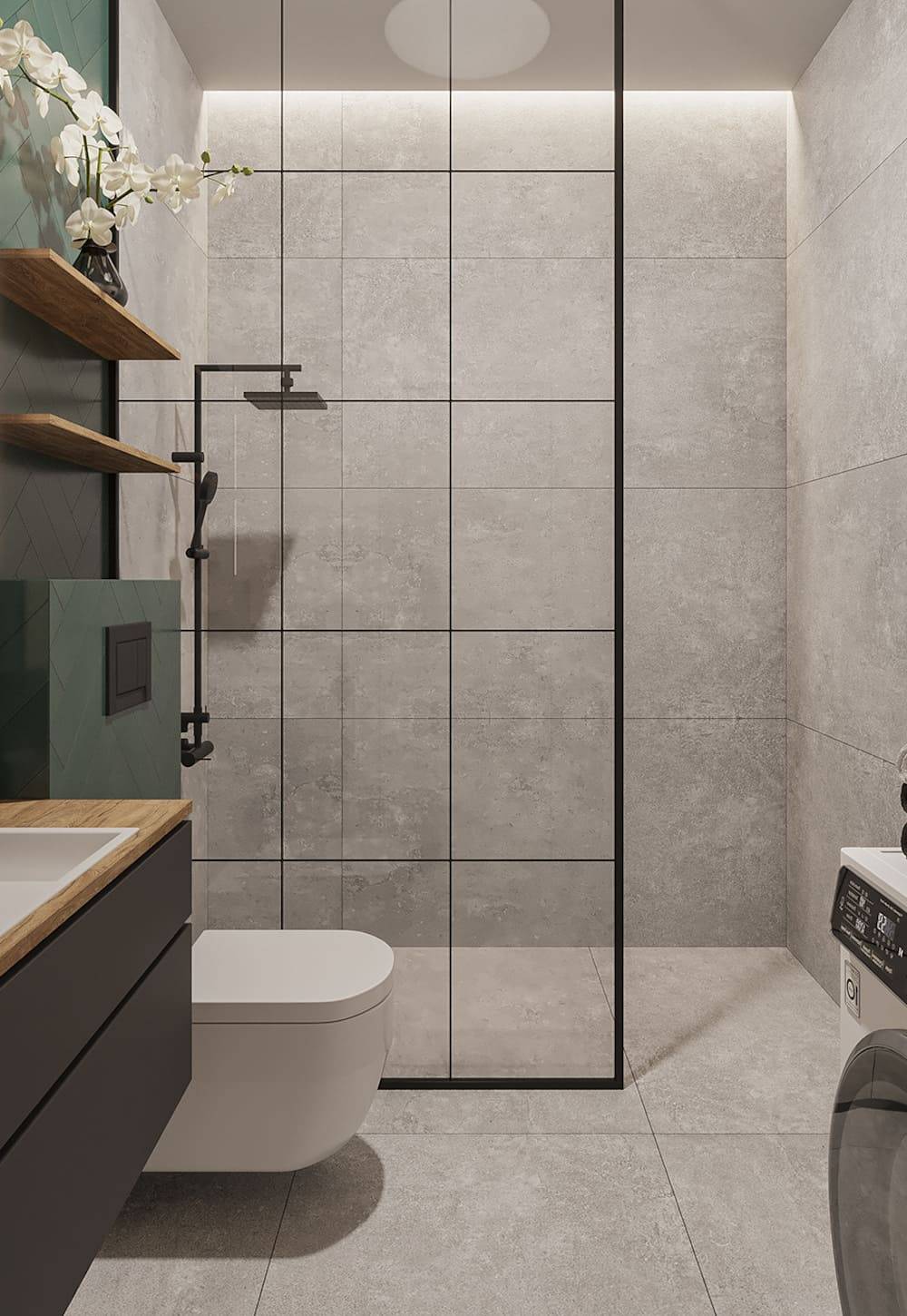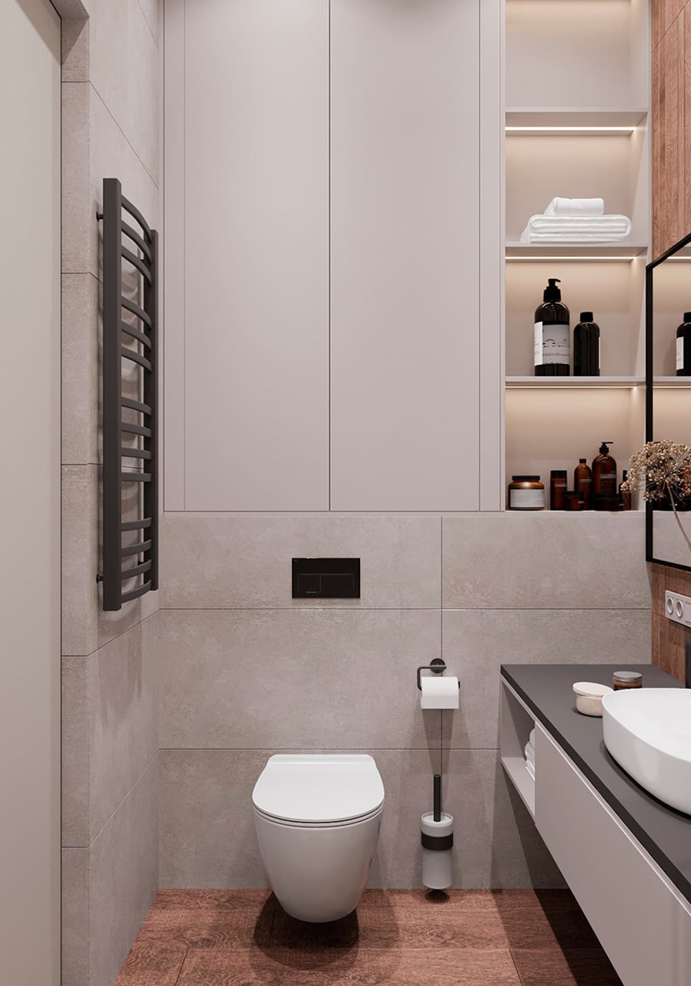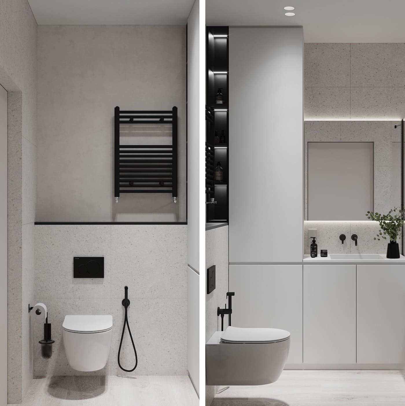 Минимализм. Основной цвет — серый во всех своих оттенках. Используемые материалы: бетон, стекло, металл. Сантехника обычно встраивается в стену или крепится в подвешенном виде.