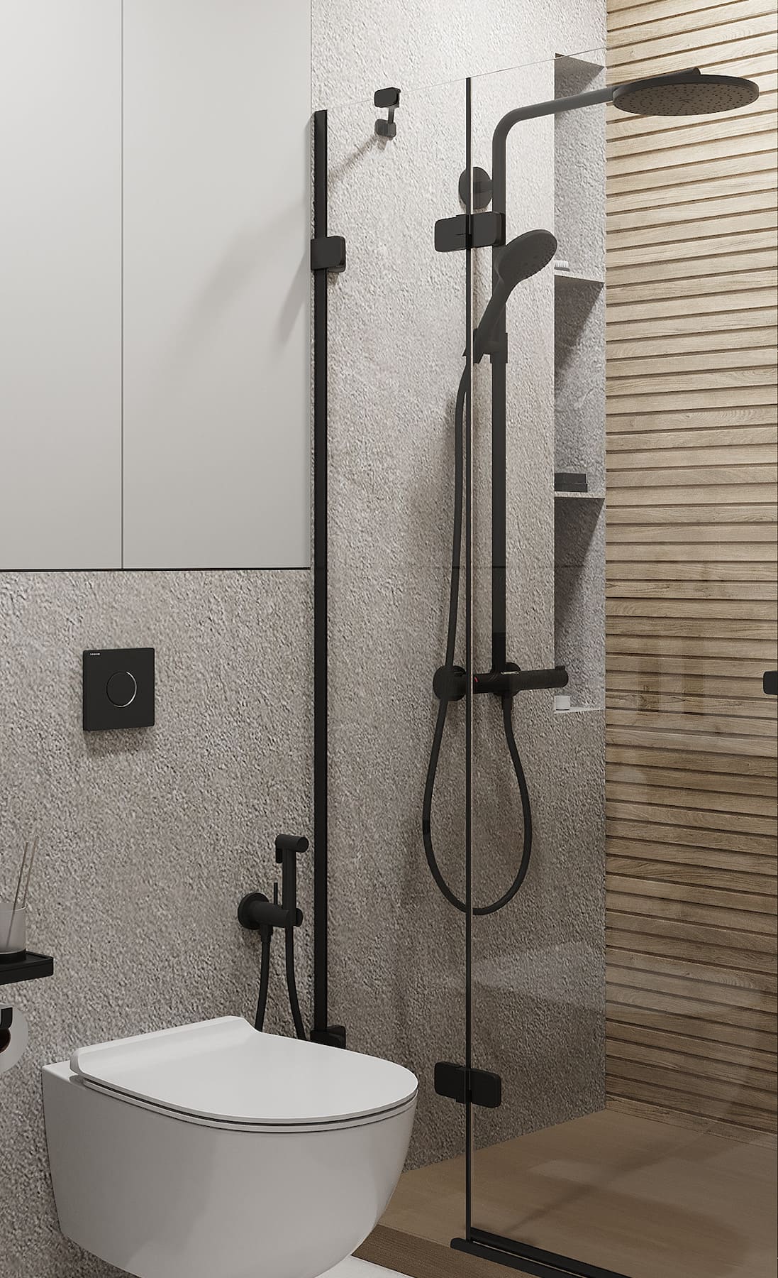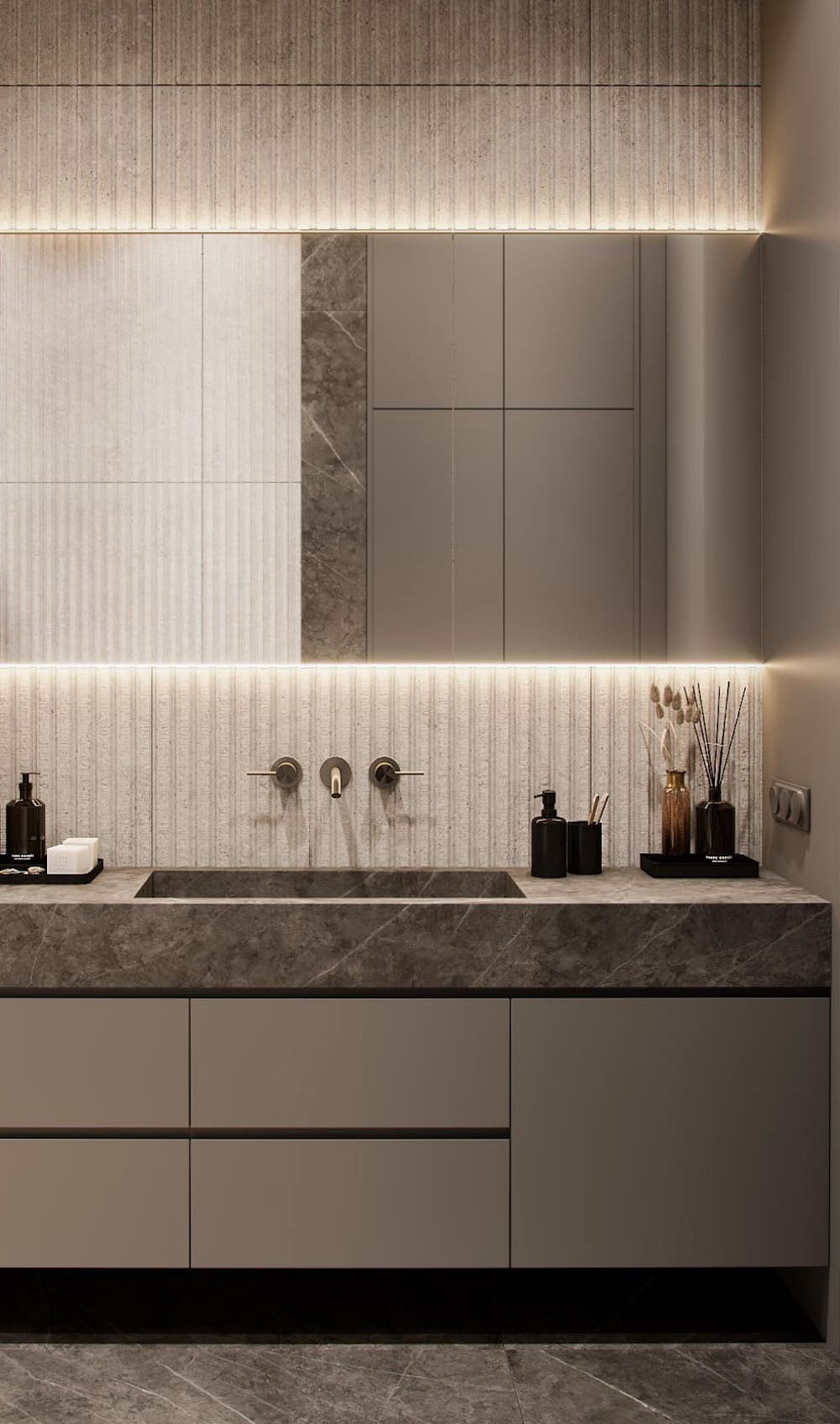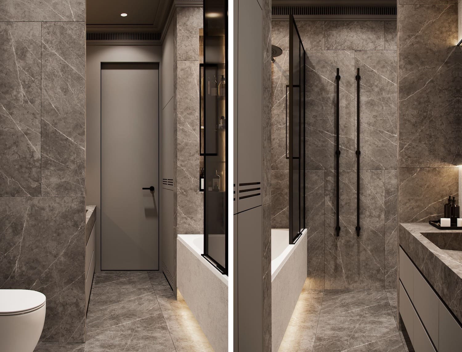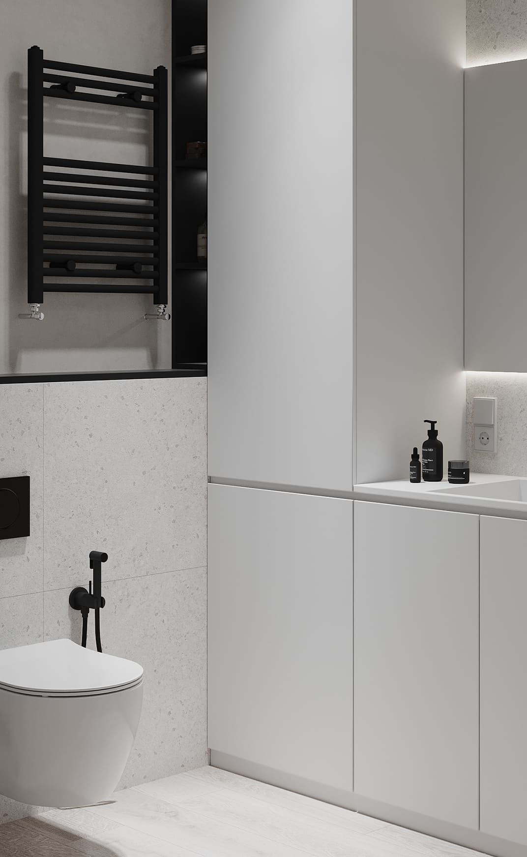 Минимализм. Основной цвет — серый во всех своих оттенках. Используемые материалы: бетон, стекло, металл. Сантехника обычно встраивается в стену или крепится в подвешенном виде.