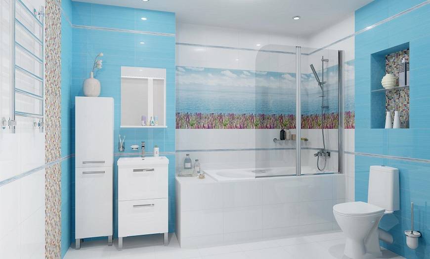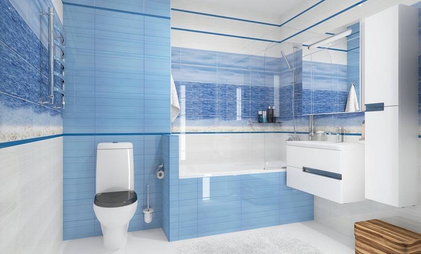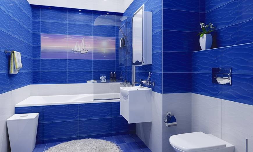 Несмотря на характерный холод, синий цвет широко применяется при облицовке санузлов. Его можно совместить с желтым, оранжевым и прочими теплыми тонами.