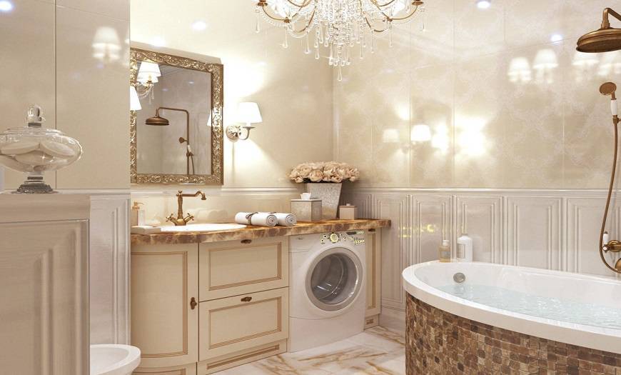 Классическое оформление. Стандартная ванная комната явно не будет смотреться с яркими, броскими элементами. Стоит учитывать все мелочи при расстановке мебели. Цвета должны быть сдержанными, материалы – натуральными