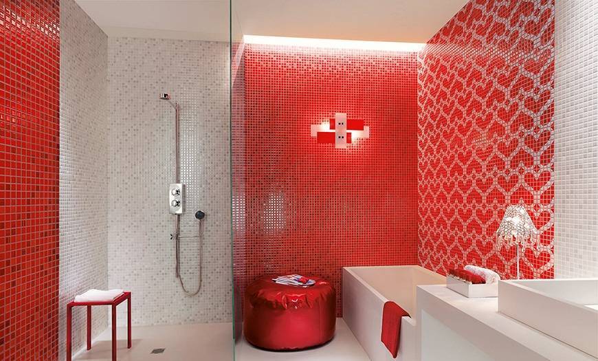 В ванной принято использовать нейтральные, спокойные оттенки. Но можно гармонично внедрить и яркие сочетания цветов и фактур.