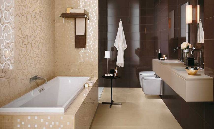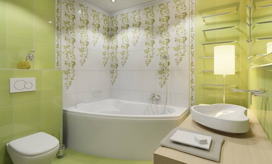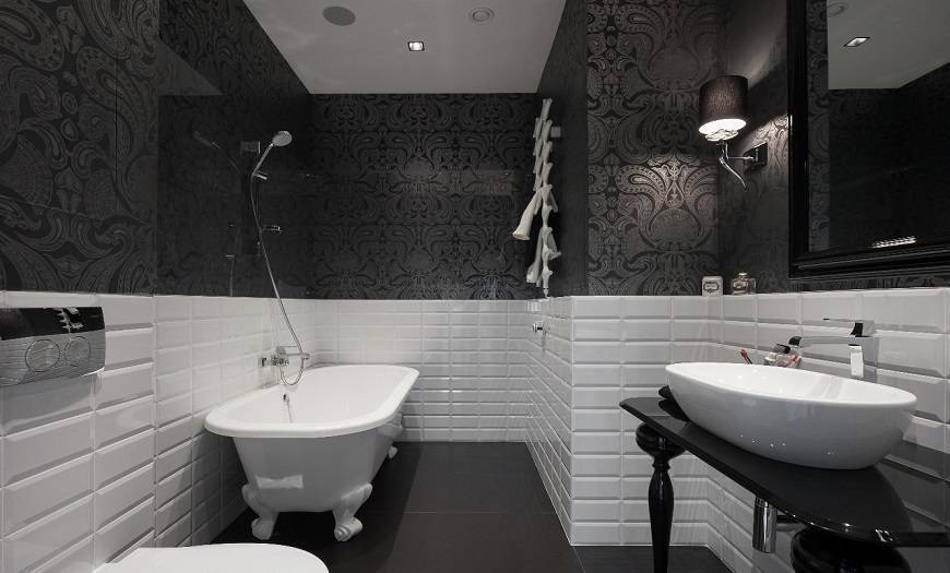 Облицовка керамической плиткой всей комнаты является дорогостоящим занятием, поэтому дизайнеры предлагают проекты, в которых разные материалы для отделки стен комбинируются. К примеру, вокруг ванны укладывается плитка, а все остальное пространство отделывается панелями или штукатуркой, которая устойчива к высокой влажности.