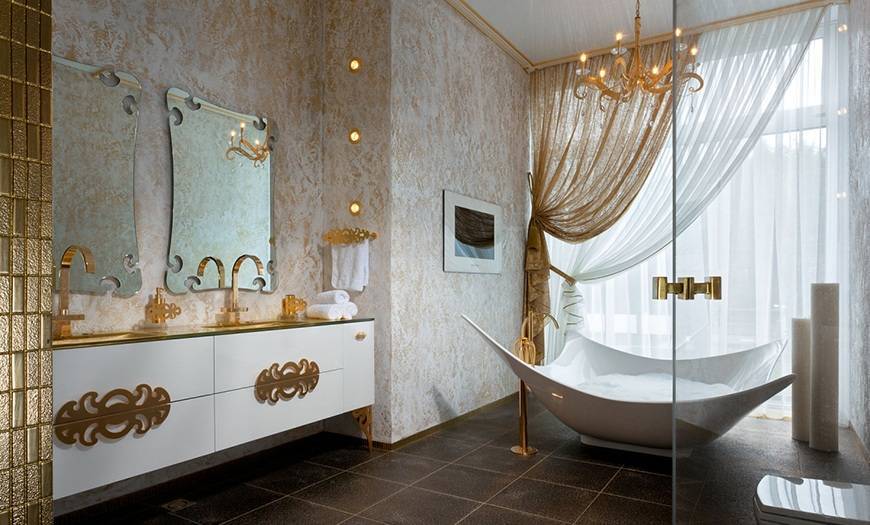 Грамотная комбинация золотых оттенков с серым, серо-голубым или серо-бежевым подчеркнет элегантность интерьера. Теплая палитра с использованием фактуры полированного никеля подойдет для любых стилевых направлений.