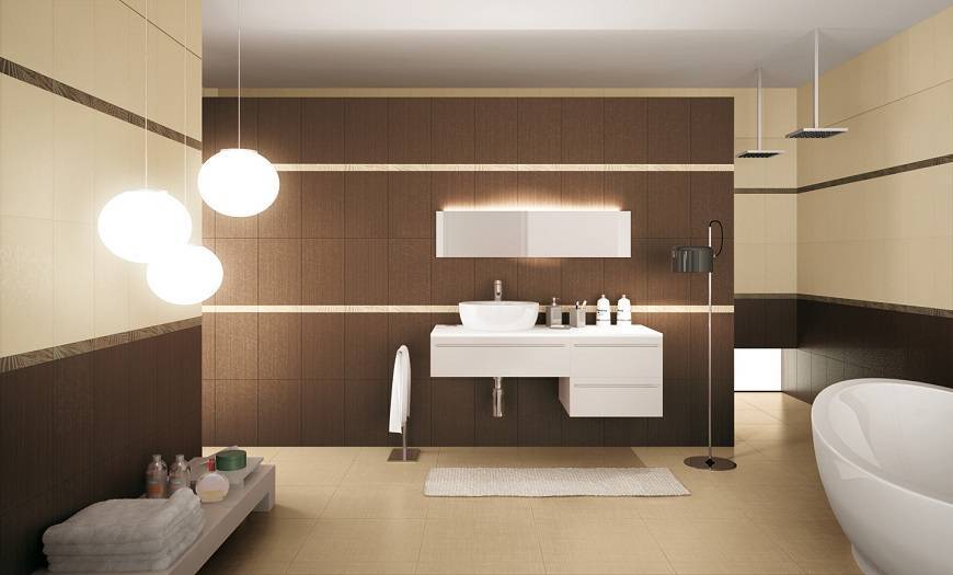 Для облицовки стен в ванной, очень часто используют керамическую плитку или пластиковые панели. Это связано с устойчивостью этих материалов к воздействию влаги и механических повреждений, легкостью в уходе и большому выбору различных вариантов. Встречаются модели керамической плитки, повторяющей поверхность мрамора или дерева. Для расширения пространства используется прием вертикальных или горизонтальных полос.
