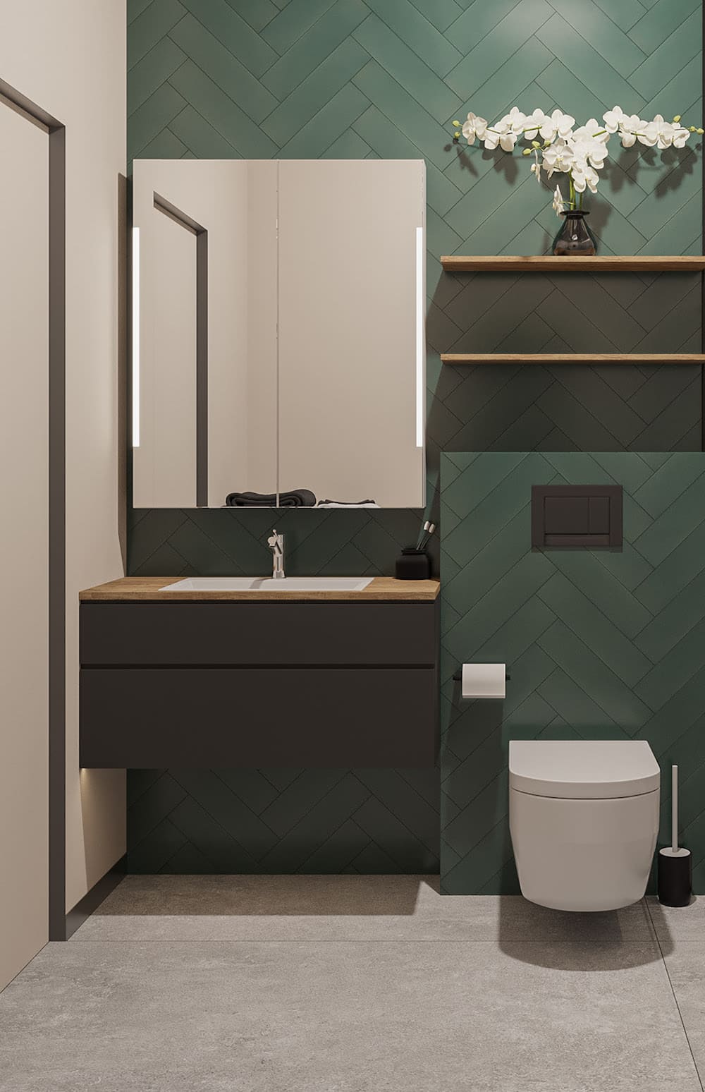 Положительное влияние этого цвета на психическое здоровье доказано наукой. Оттенок позволяет сформировать свежий и успокаивающий интерьер. В зеленой палитре можно обыграть напольное покрытие, а стенам придать голубую концепцию.
