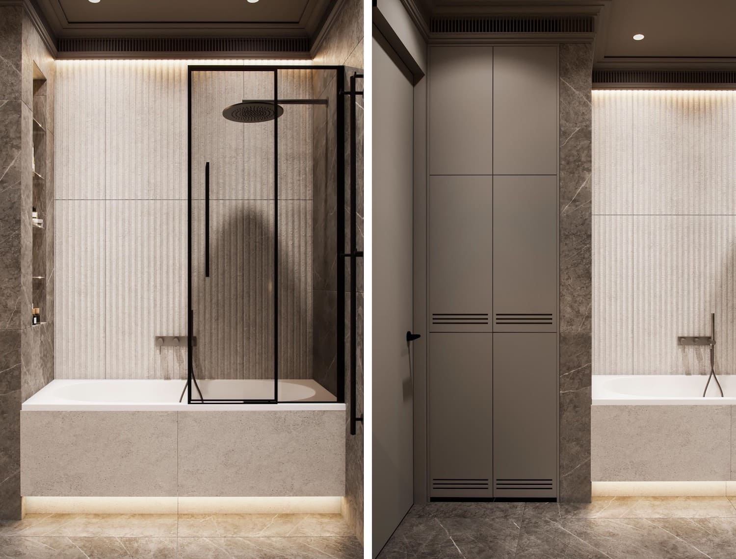 - Перед ванной оставляют пространство от 50 см до 120 см, чтобы удобно было выходить и пользоваться полотенцем.