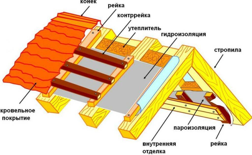 Правильно выполненная вентиляция позволит избежать на долгое время конденсата, тем самым увеличит сроки эксплуатации крыши из профнастила. Она состоит из следующих элементов: