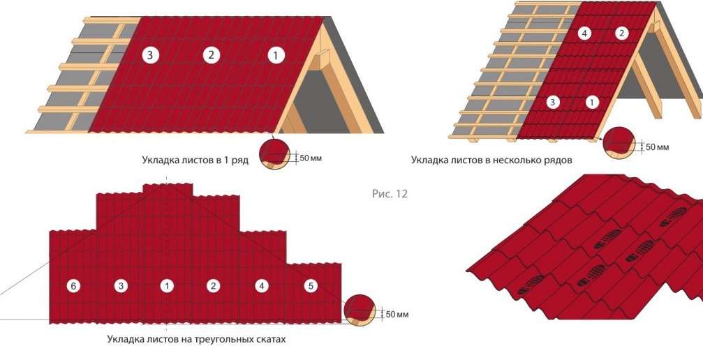 Монтаж начинают с нижнего угла ската. Кровельный материал укладывают на обрешетку следующем порядке: