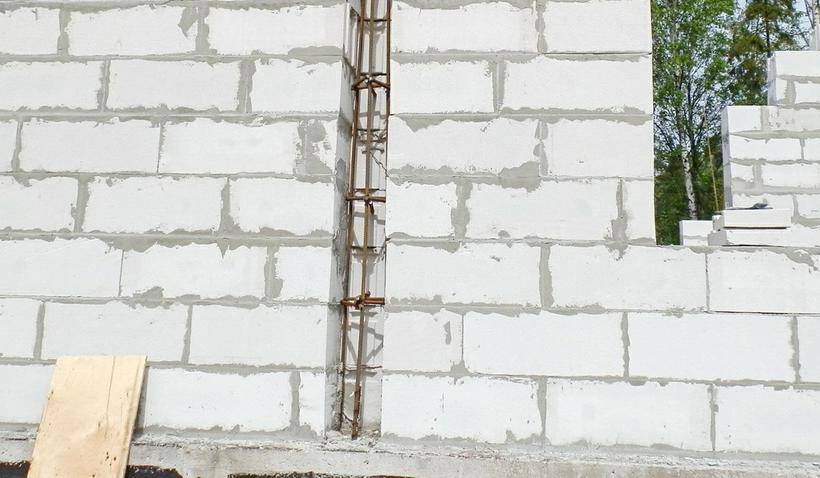 В стенах при помощи бура с коронкой выполняется вертикальное штробирование, монтируют О-образные профили из газобетона. Внутрь вставляют 1-4 стержня диаметром не меньше 1,4 см. Бороздки с арматурой заполняются бетоном марки М 250-300.