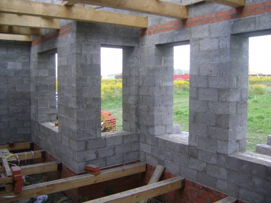 Для несущих и ограждающих конструкций используется блок марки от М50. Для перегородок в доме – перегородочный материал. Блоки кладутся на цементный раствор. По рекомендациям владельцев домов каждый пятый ряд кладки армируется. Работы начинаются с выгонки углов, потом продвигаются вдоль стены.