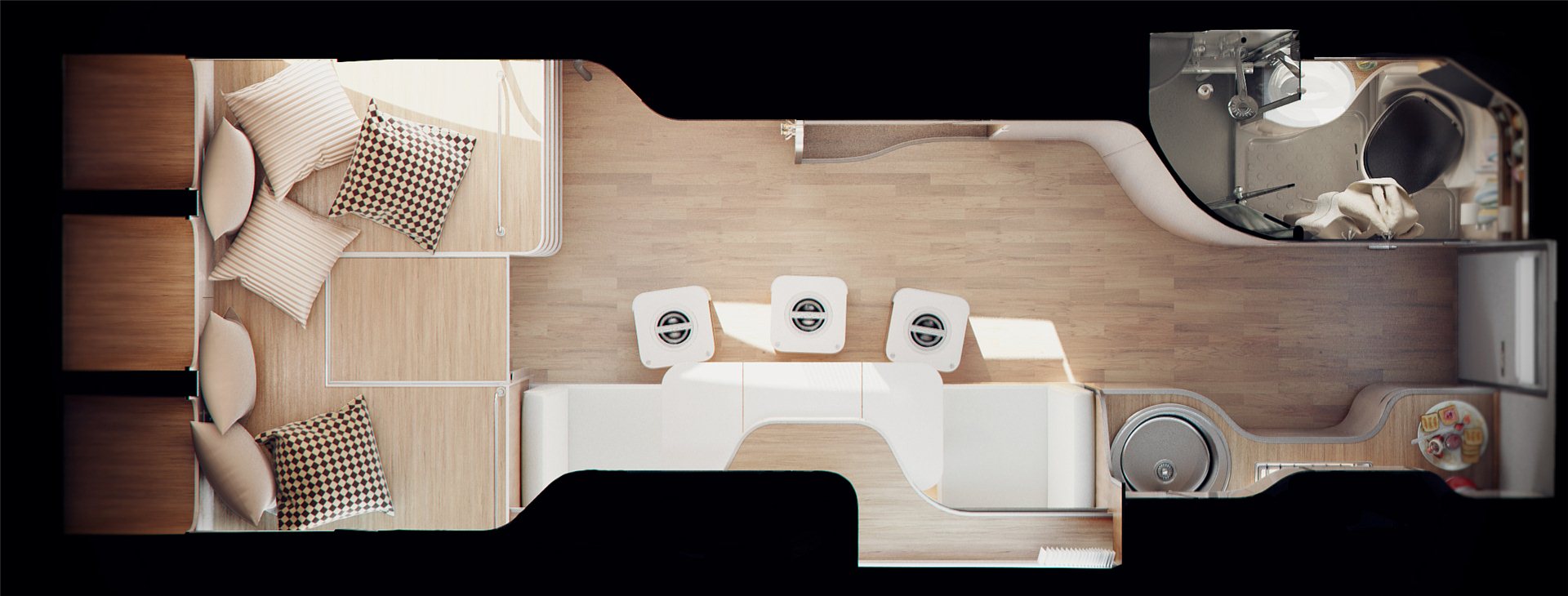 - Нижнее пространство кровати передвижного жилья используется в двух вариантах: под ним можно оборудовать выдвижной стол или сделать дополнительное спальное место.
