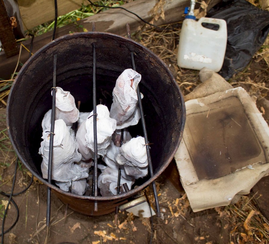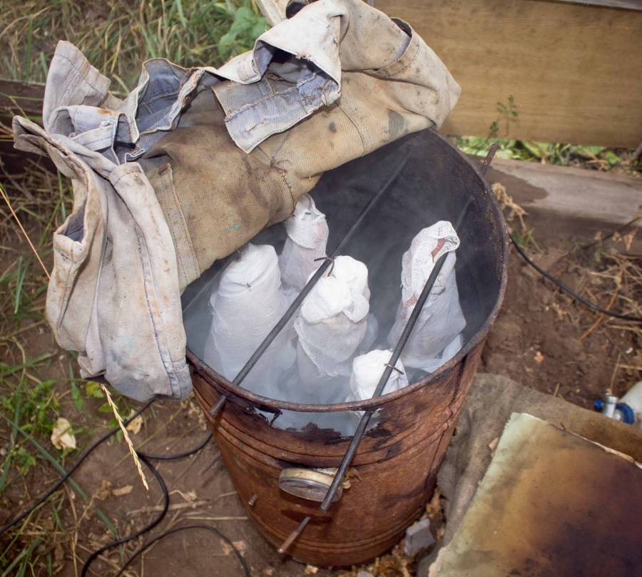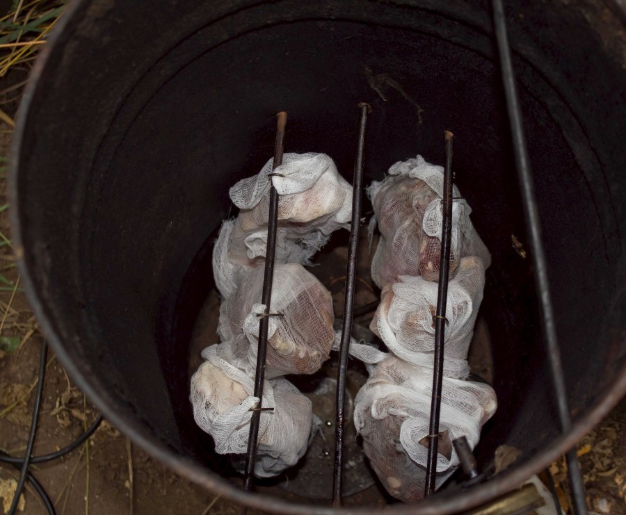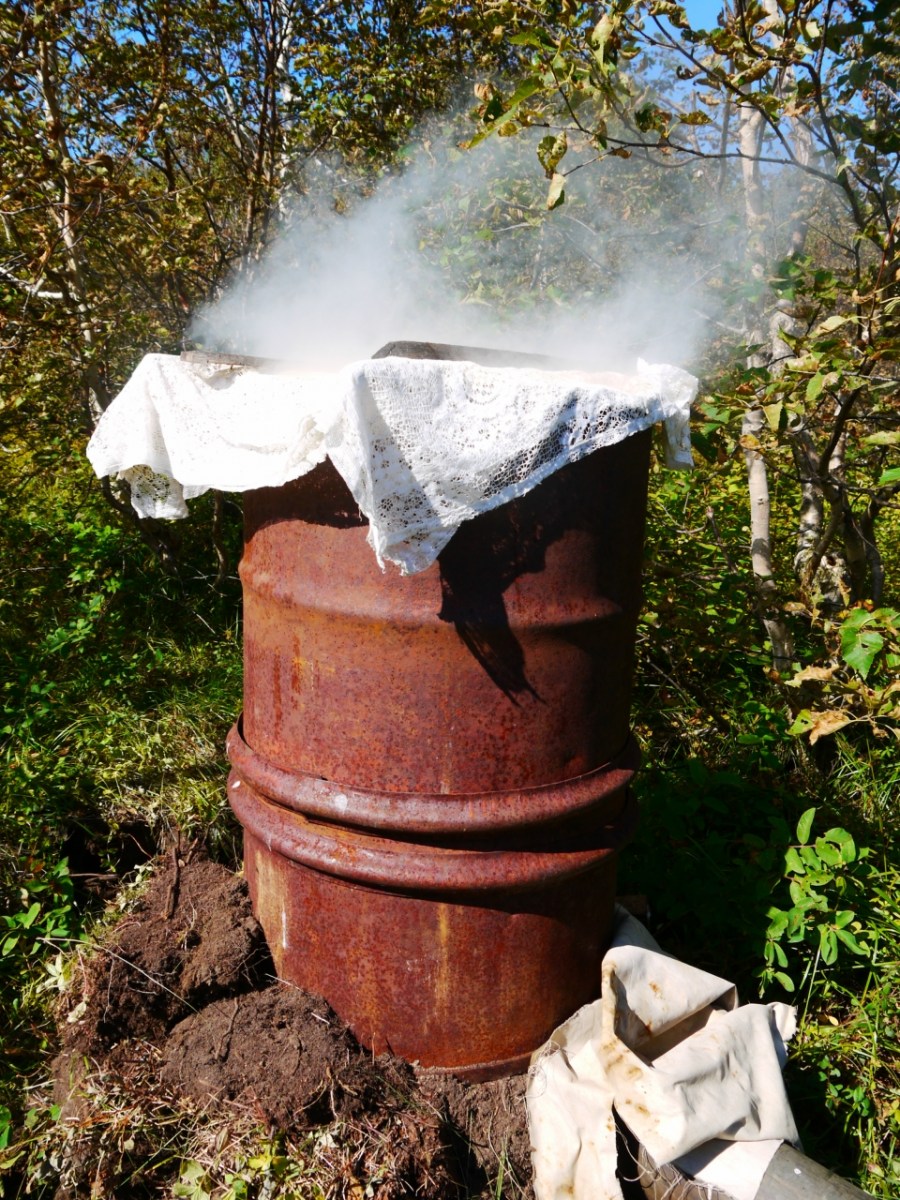 Внутри устраивается одна или две решетки. Материал — деревянные прутья (рис.2), часть строительной сетки (для армирования или кладки кирпича). емкость располагается на опорах (кирпич, камни, бревна). Под ней разводится костер. В качестве крышки, если таковая отсутствует, используется мешковина, кусок брезента, ветки с зелеными листьями.