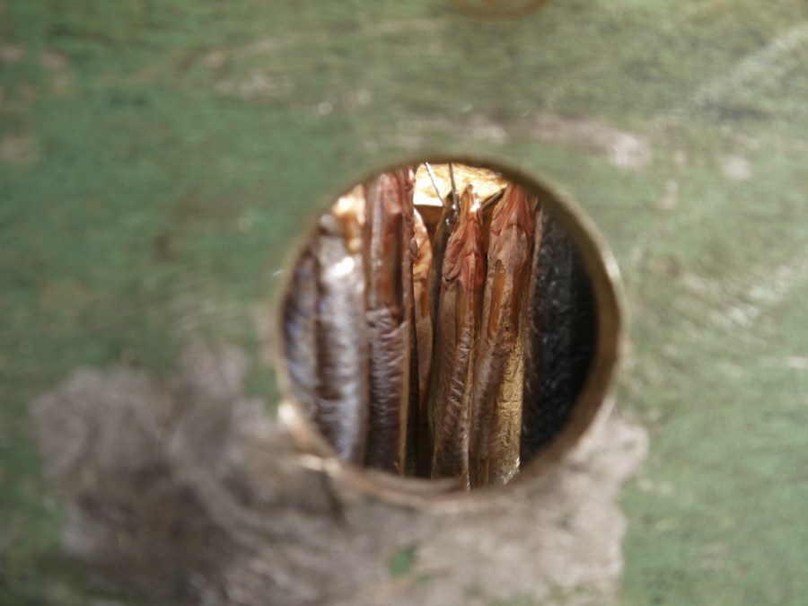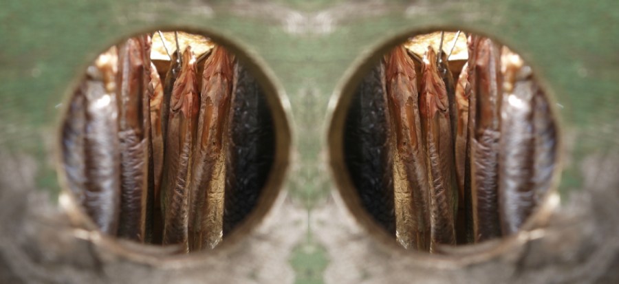 Это конструкция не требует под себя какого-то особенного места (ни по площади, ни по иным критериям). Она проста и нетрудоемка. Визуально представляет из себя некий шалаш конической формы, внутри которого на определенной высоте подвешены куски рыбы или мяса. Внизу сооружения горит очаг, и поддерживается температура + 25° С, а также влажность в 65%.