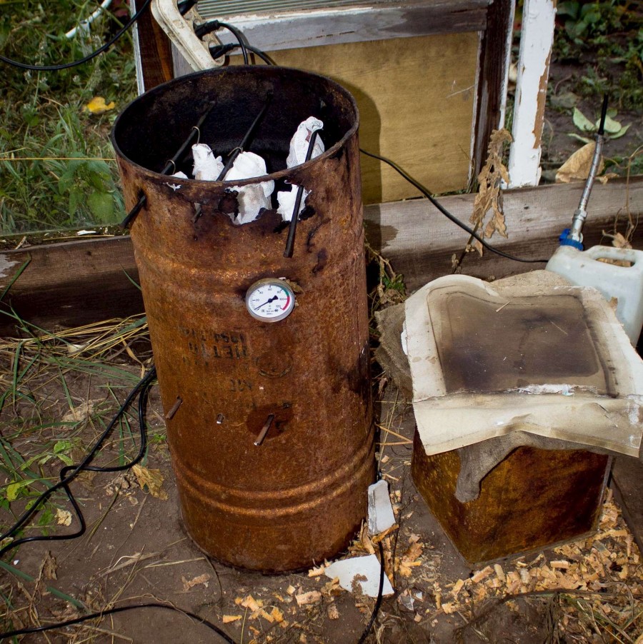 Если все происходит на улице в холодное время года, то необходимо предусмотреть подогрев коптильного шкафа. Для этого подойдет обычная лампа освещения. Светодиодная лампа не подойдет, она выделяет недостаточное количество тепла.