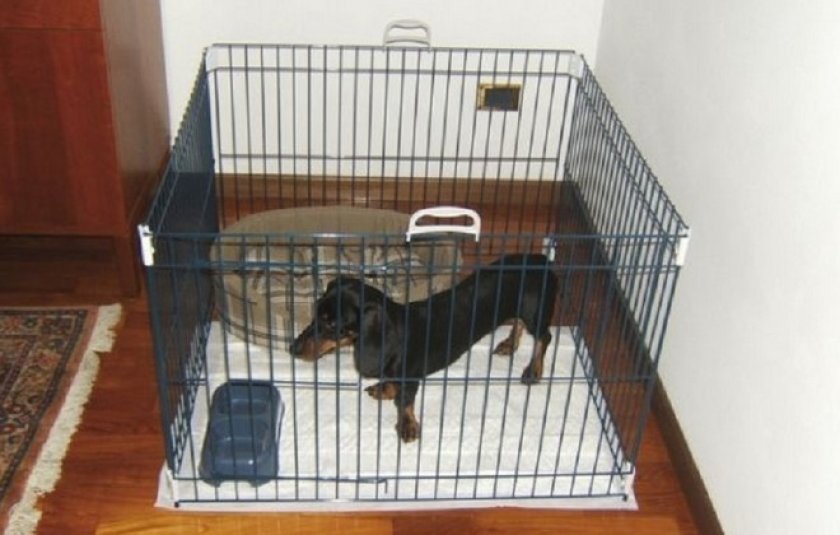 Для первого раза достаточно, если собака проведет там около 5 мин. Главное, чтобы она не пугалась. Спешка в приучении только насторожит животное и придется начинать все заново. Скоро оно поймет, что в комнатном загончике безопасно, и останется в нем на нужное хозяину время