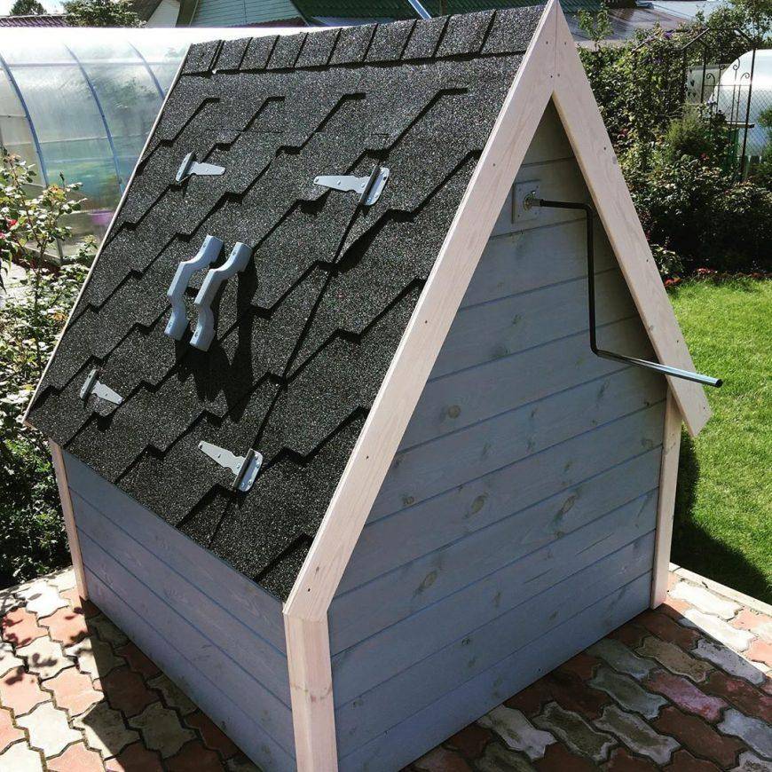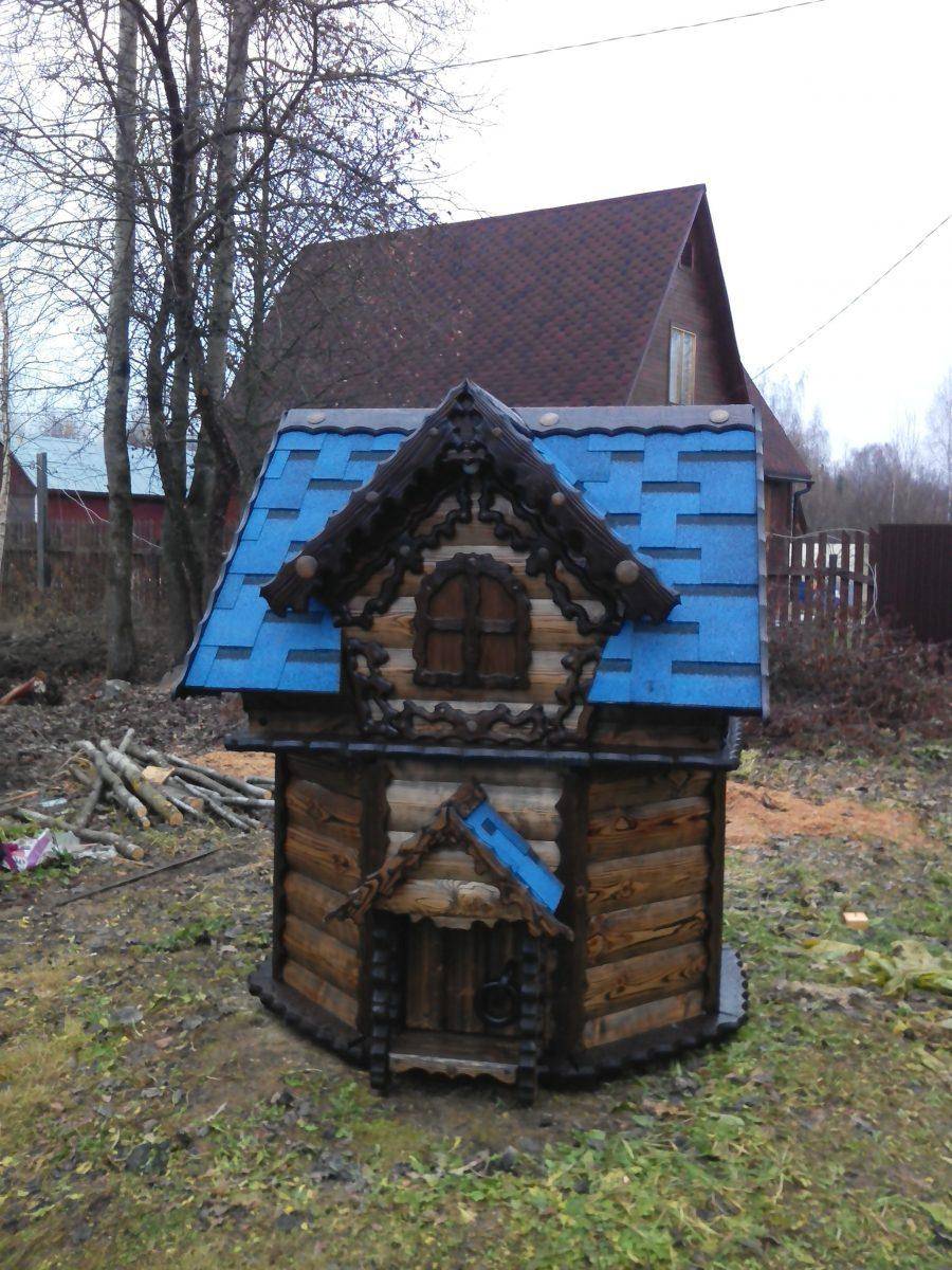 Для ее возведения используется брус 10 см. Асимметричные скаты отличаются длиной, что придает крыше особую привлекательность. Готовый домик будет достигать в высоту 2.2 метра, а в ширину — 1.2 метра (у основания). Декорировать постройку можно вращательным колесом вместо рукоятки.
