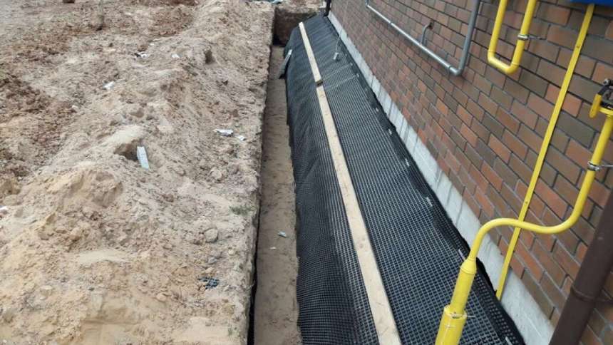 На расчетном уровне от дома выкапывается по определенному размеру траншея. Учтите, что она должна на несколько сантиметров превышать размер трубы (если обустраивается трубчатый дренаж);