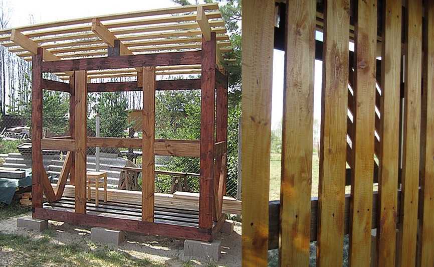 Простым решением будет сооружение каркаса с кровлей из деревянных брусьев. Но у такого варианта имеется существенный недостаток, который заключается в отсутствии задней стенки, в результате чего все дрова в дождливую погоду может залить водой.