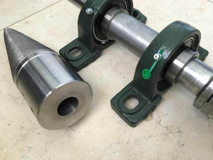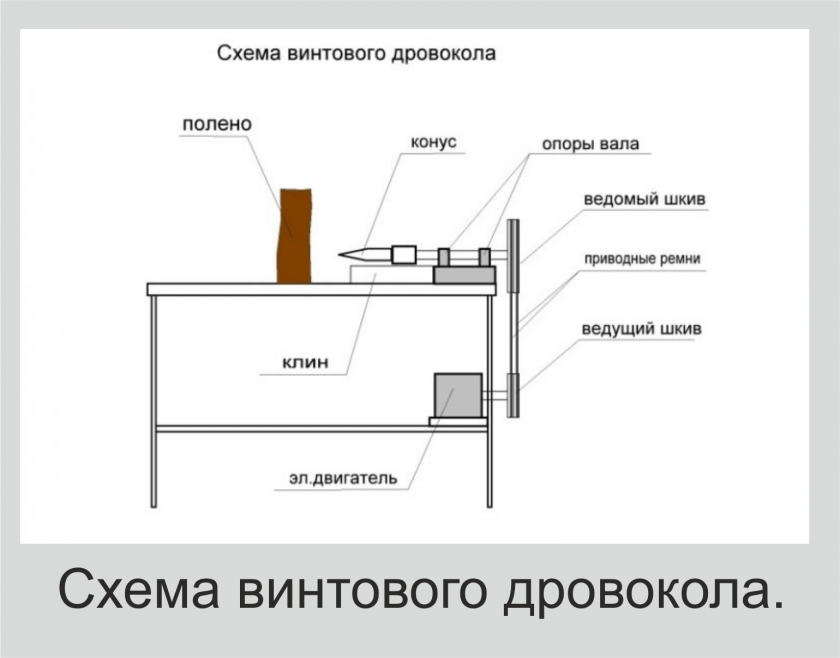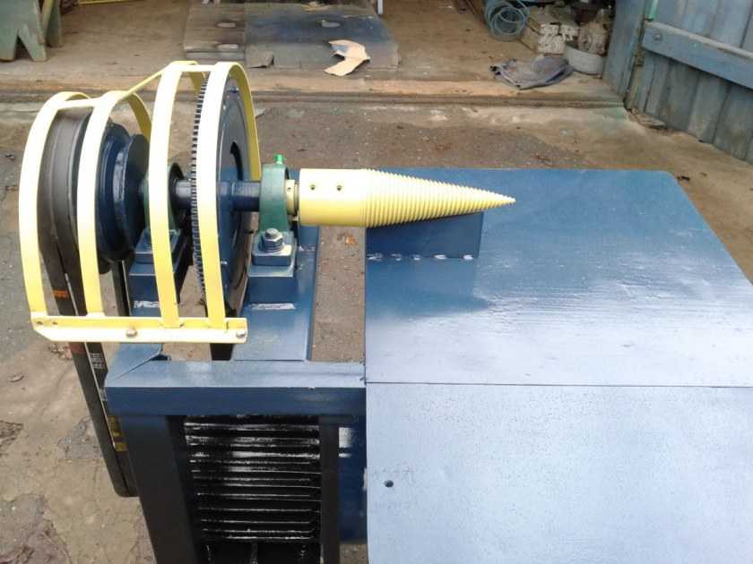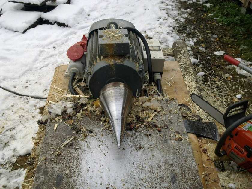 Подобный тип дровокола работает с помощью вращающегося металлического конуса, раскалывающего бревна за счет специальной резьбы. При сборке винтовой модели с конусообразным колуном необходимо правильно подобрать конус в зависимости от используемых бревен. Основание для устройства имеет вид рабочей площадки с закрепленным валом колуна. К столу приваривается киль, позволяющий избегать попадания частиц под вращающийся механизм. Монтируются силовые опоры, и колун устанавливается в рабочее положение. Затем подсоединяется двигатель.