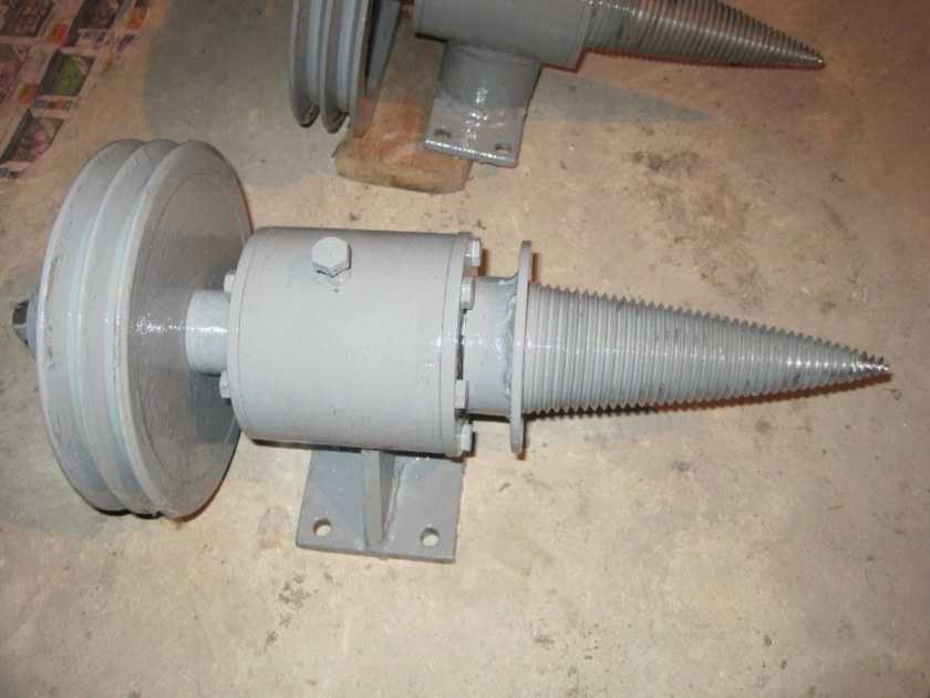 Проще всего самостоятельно собрать винтовой агрегат. Для этого нужно купить винтовой конус для дровокола. Также понадобится мощный двигатель, крепкая станина, понижающий редуктор и вал.