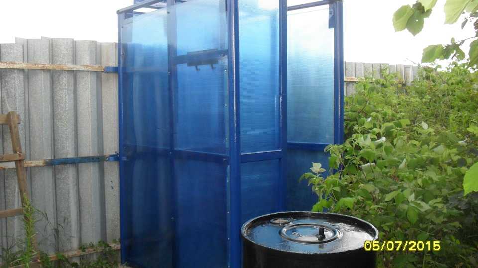 Если есть возможность самому сварить металлический каркас, то можно сделать надежный летний душ с тентовым покрытием. Обшивку стен можно менять по мере износа, а каркас будет служить долго.