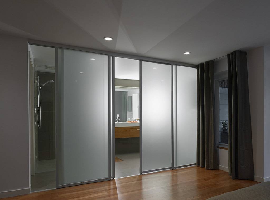 Устроены по типу шкафа-купе. Экономят пространство, полностью открывают дверной проем, но хуже изолируют помещение, так как полотно прилегает не плотно. Могут сдвигаться вдоль стены, что требует небольшого зазора при установке мебели и сантехники, или во внутреннюю полость.