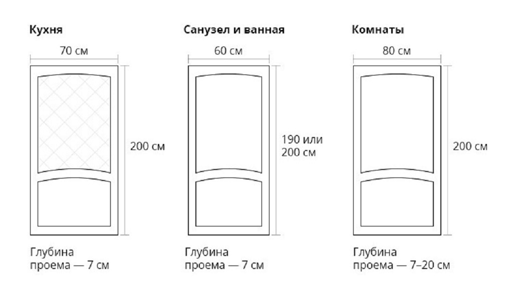 Стандартные габариты в типовых квартирах варьируются от 55 до 70 сантиметров в ширину, а в высоту соответствуют остальным дверным проемам в помещении