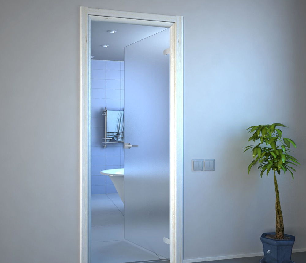 Стекло — абсолютно безопасный с экологической точки зрения и хороший материал, а новые технологии производства изделий из этого сырья исключают возможность ранения об осколки. Даже при сильном ударе дверь не разлетится на осколки, вы увидите только сеть трещин внутри полимерной пленки. Недостатком стеклянной межкомнатной двери является ее дороговизна и тяжелый вес, что подразумевает форсирование проема и выбор прочной фурнитуры. В эстетических соображениях в ванную комнату следует выбирать модели из матового стекла.