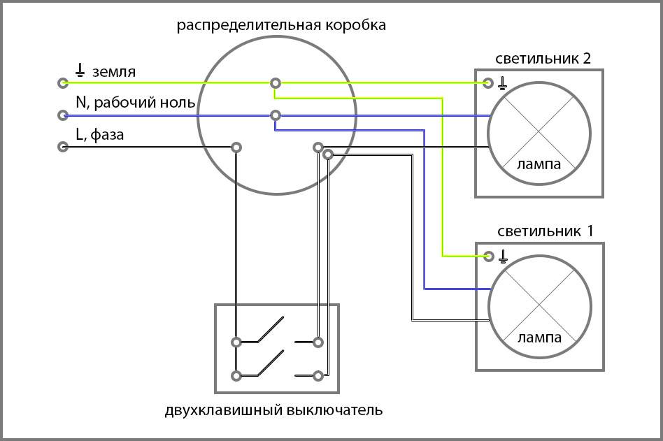 Схема подключения двухклавишного выключателя на две лампочки при наличии в сети заземляющего проводника