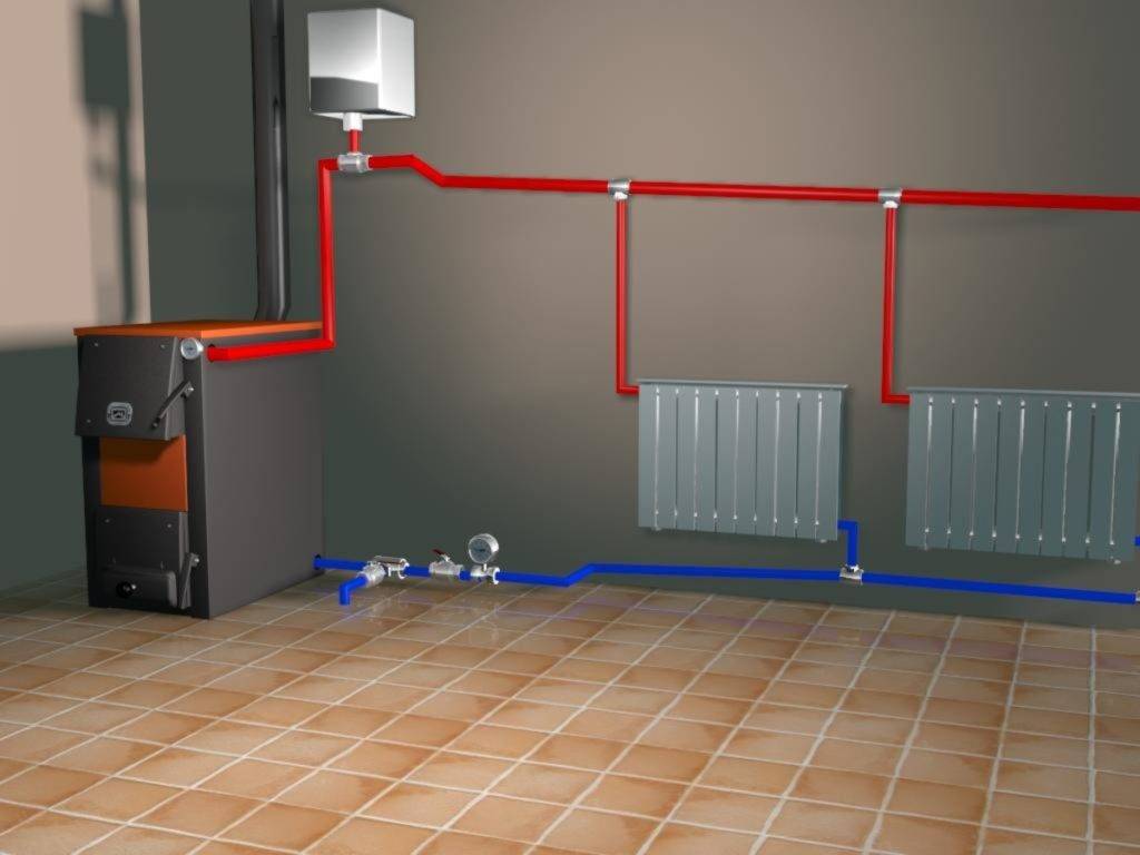 в этом случае сеть отопления имеет самый высокий КПД (выбирается наиболее удачное место расположения котла, радиаторов и трубопровода).