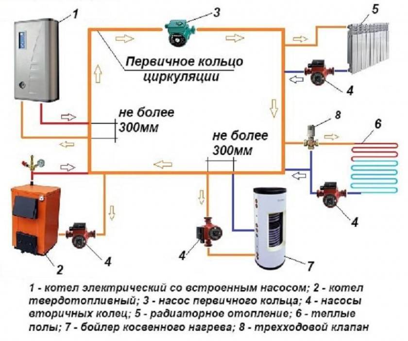 Множество моделей современных отопительных котлов оснащается встроенным циркуляционным насосом, что упрощает их подключение. В ситуации, когда в доме присутствуют несколько разных систем отопления (радиаторы, греющие полы, бойлер косвенного подогрева воды), рекомендуется схема обвязки газового котла отопления с гидравлическим разделением на контуры (гидрострелкой).