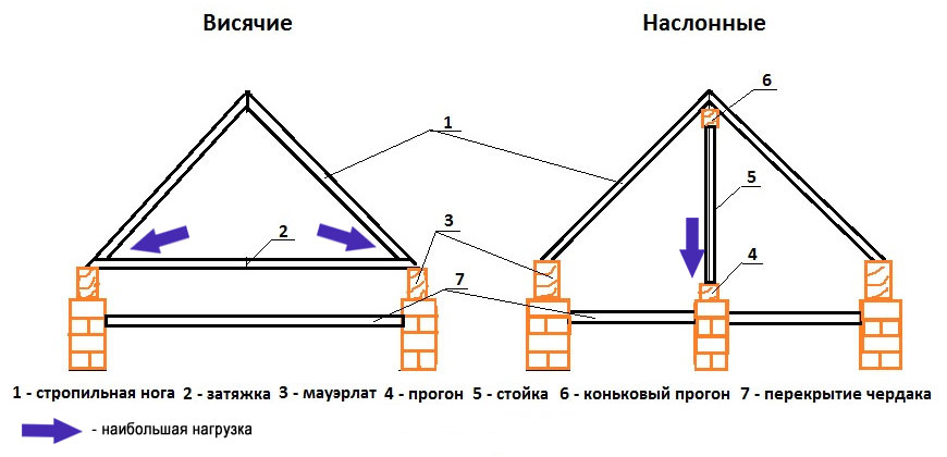 Висячие стропила не имеют опор внутри, а опираются только на две внешние основные опоры. Наслонные стропила опираются на внутренний элемент.