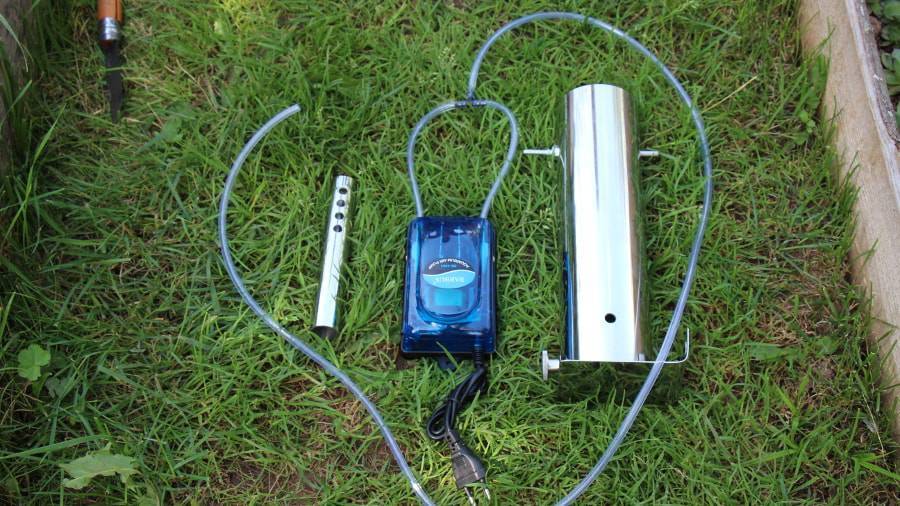 Для работы сначала необходимо насыпать опилки в генератор дыма. Внизу основной трубы сделана сетка. Сетка в случае использована штукатурная, сложенная вдвое, чтобы ячейки были меньше. В низ трубы на сетку насыпаются опилки, низ прикрывается крышкой, остается небольшой зазор для поддува. Наддув за счет крышки может регулироваться: больше – меньше. Также необходим компрессор. Компрессор подключается к конструкции, за счет чего происходит вдувание воздуха. «Система» входит на приблизительно 15 мм в дополнительную трубу. За счет тяги опилки внутри основной части начинают тлеть. Верх прикрывается крышкой.