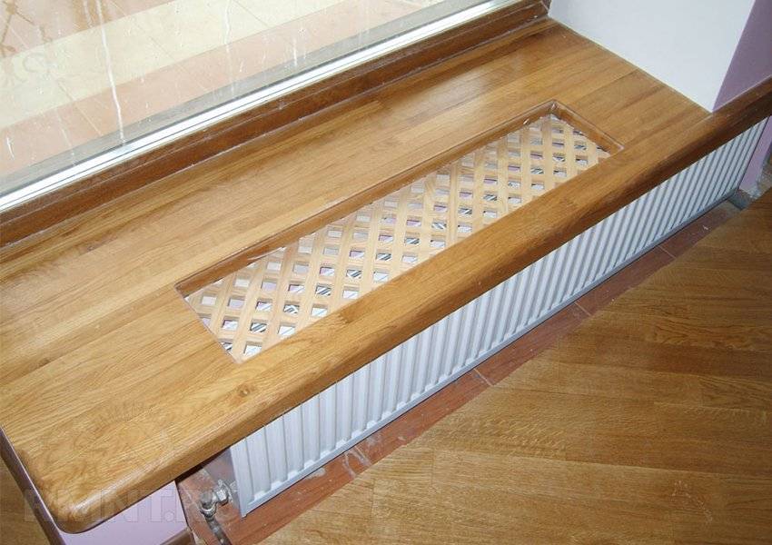 Иногда варианты радиаторных решеток дополняют конструкцией в виде козырька. Он удобен в том случае, когда радиатор находится под подоконником. Узкая стальная полоса или вариант из МДФ не допустит скапливания теплоты и перенаправит ее внутрь.