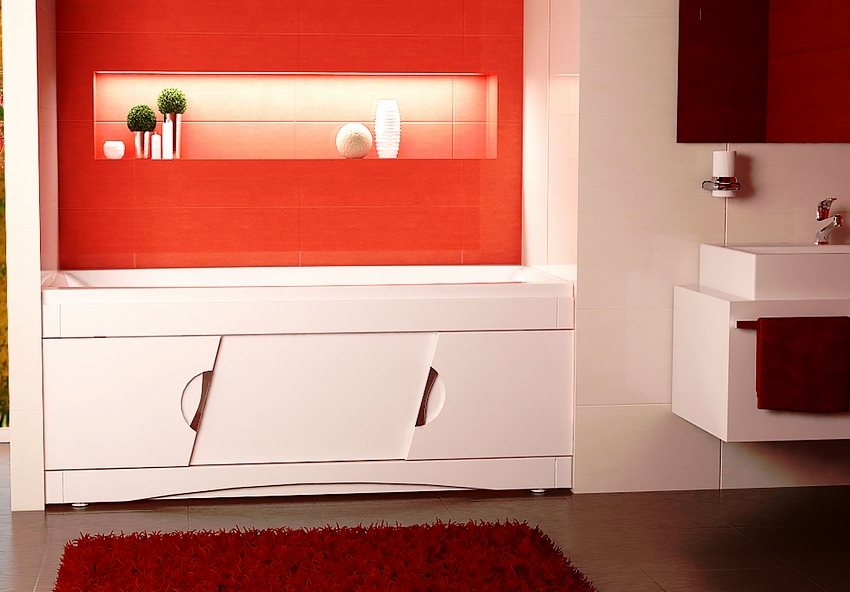 глухой стеной — данный тип экрана собой закрывает полностью все пространство под ванной, не предполагая никаких выемок для удобства или ниш для вещей. При его установке следует тщательно перепроверить исправность всей сантехники и труб, так как потом это будет сделать проблематично. Обычно, такие типы экранов предполагают наличие небольшой дверцы для проверки состояния сантехники.
