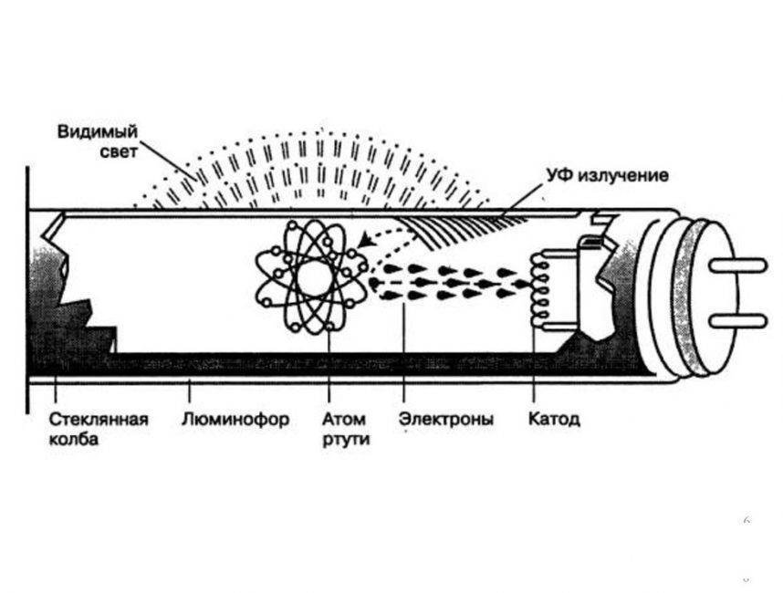 Чтобы понять, каким образом осуществляется подключение люминесцентных ламп, требуется понять принцип их работы. Внешне они выглядят как стеклянные цилиндры, воздух в которых полностью заменен инертным газом, находящимся под небольшим давлением. Здесь же находится небольшое количество паров ртути, способных ускорять ионизацию – движение электронов.