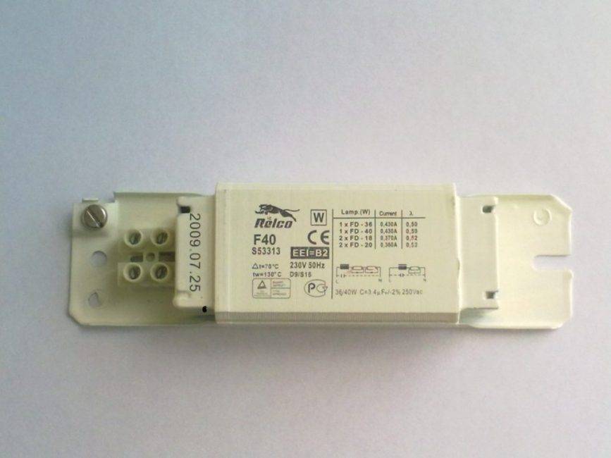 По сути, балласт для люминесцентных ламп представляет собой дроссель. Он регулирует силу подачи тока, ограничивая или разделяя разночастотные электрические сигналы. Ликвидирует пульсации постоянного тока. Происходит нагрев катодов люминесцентных ламп.