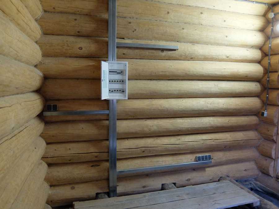 - Если баня имеет исполнение из дерева, то электропроводка допускается только открытого типа, проложенная сверху деревянных поверхностей. Запрещается размещение проводов в ПВХ трубах.