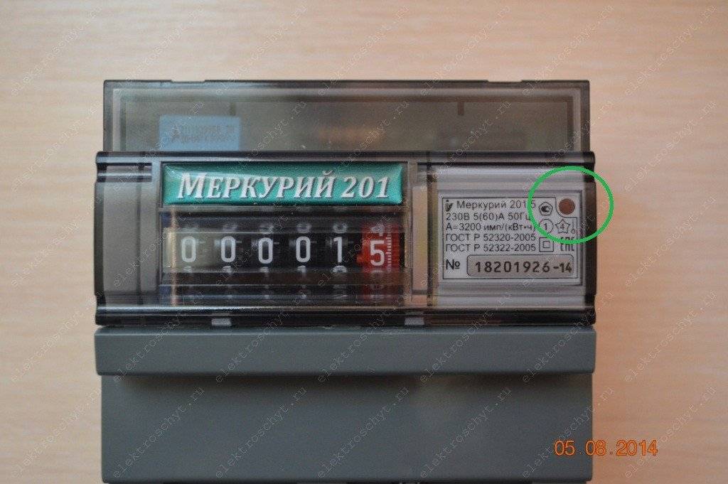 Красный световой индикатор счетчика Меркурий 201, загорается при подключении счетчика к электросети.