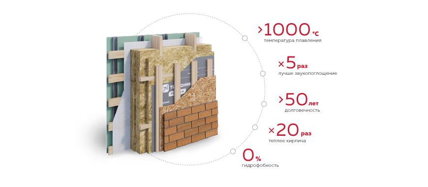 Заслуживают внимания и технологические решения, разработанные «Технониколь» для конструкций с каменной ватой. Поскольку каменная вата, как любой плитный утеплитель, при монтаже прокладывается между стойками каркаса или брусками обрешетки кровли, то при отсутствии отдельной теплоизоляции этих элементов именно они становятся мостами холода, так как теплопроводность дерева выше, чем утеплителя. В системе Дом Технониколь образование мостов холода исключено: в стенах поверх каркаса прокладывается дополнительный слой утепления, в кровельном пироге для изоляции дерева используются карбоновые бруски. Таким образом, контур утепления «Дома Технониколь» получается непрерывным.