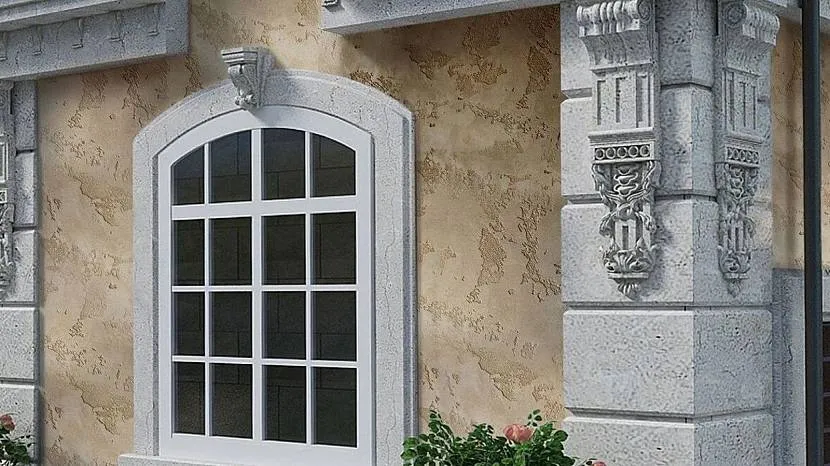По составу акриловая штукатурка очень пластична. Ей можно покрывать различные выступающие декоративные элементы здания.