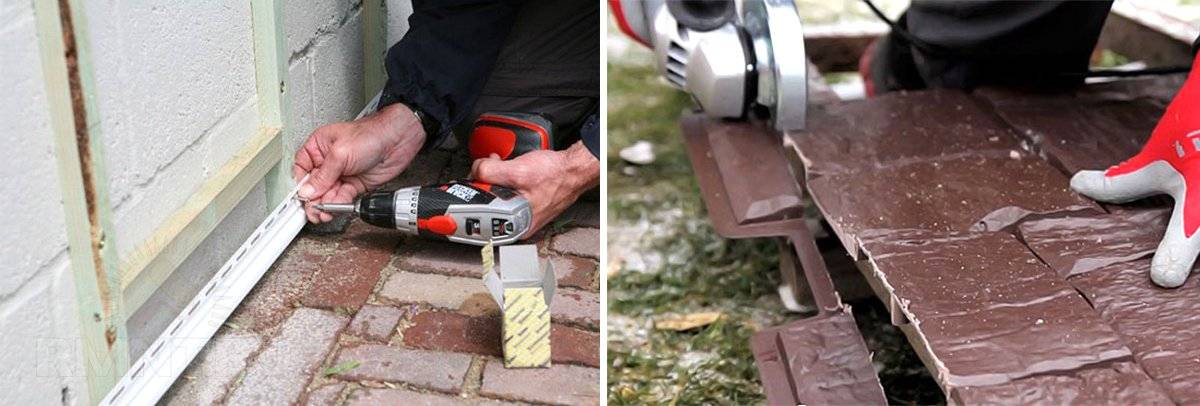 Монтаж начинается с установки стартового или J-профиля. При наклонном сопряжении с отмосткой монтаж начинаю с самой высокой точки, постепенно подготавливая нижние клиновидные доборы. Основная разница здесь в том, что стартовый профиль имитирует верхнюю замковую кромку панели, в то время как J-профиль — это простой паз, необходимый для сокрытия обрезного края