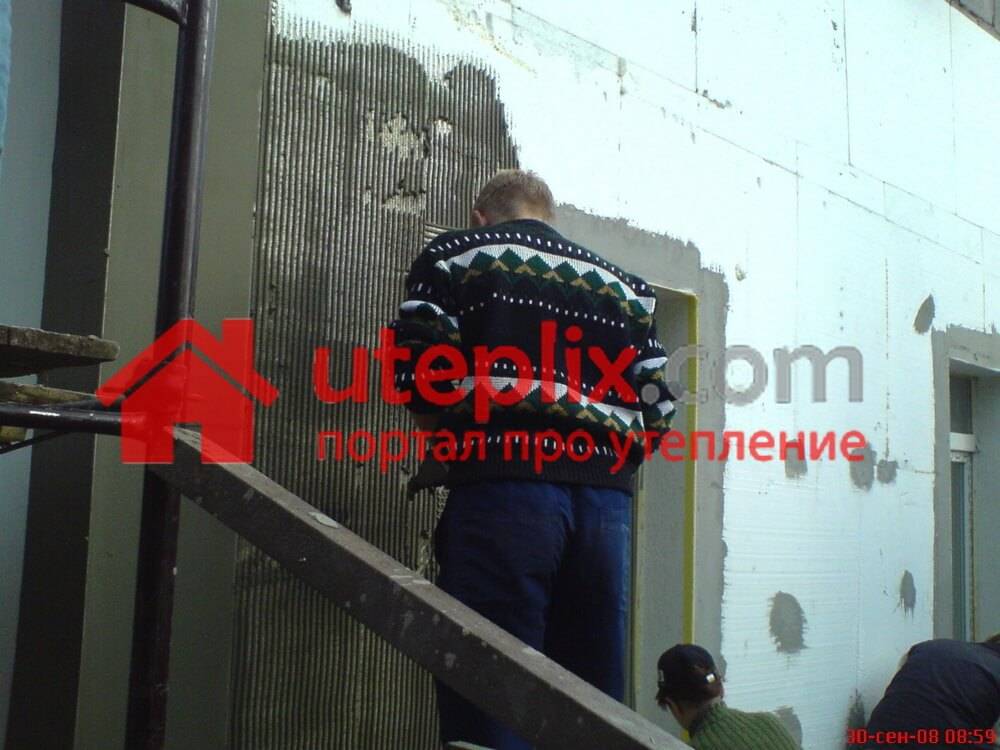 При утеплении фасада «мокрым» методом, пенопласт следует приклеивать к стене. Для этого используются специальный клеевой состав, который подходит непосредственно для типа утеплителя.