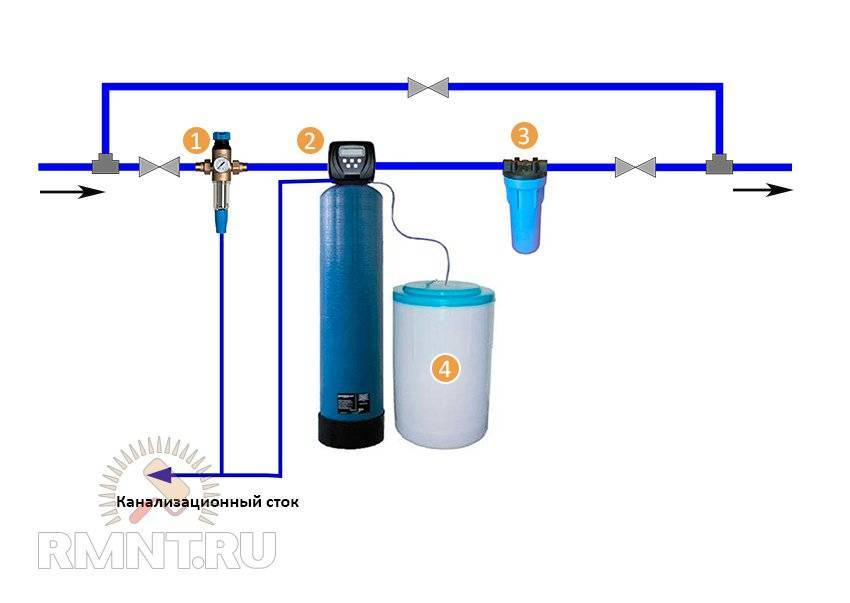 Водоподготовка. 1. Фильтр грубой очистки 100 мкм. 2. Фильтр умягчения. 3. Фильтр тонкой очистки. 4. Бак регенерации с солевым концентратом