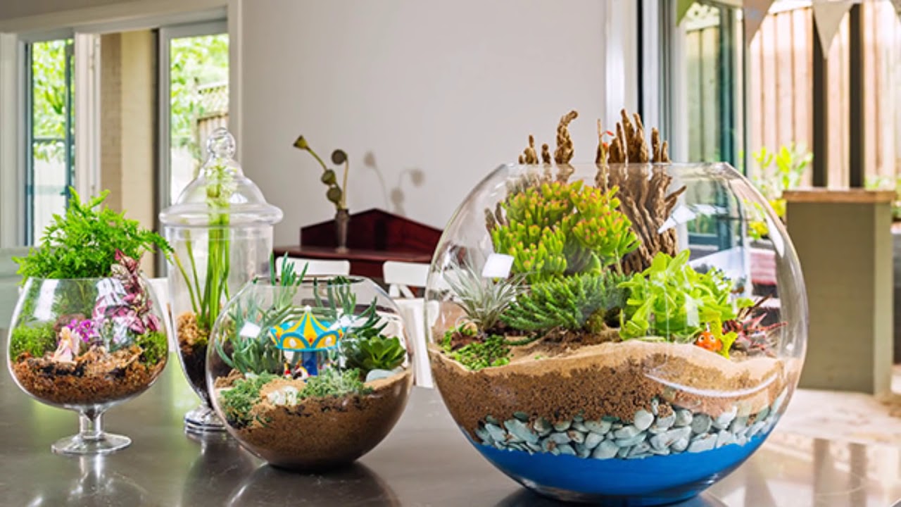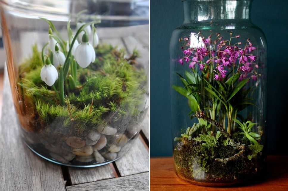Под мини-оранжереи приспосабливают аквариумы, банки, графины или бокалы любой конфигурации, воссоздают в миниатюре растительность любимого климатического пояса.