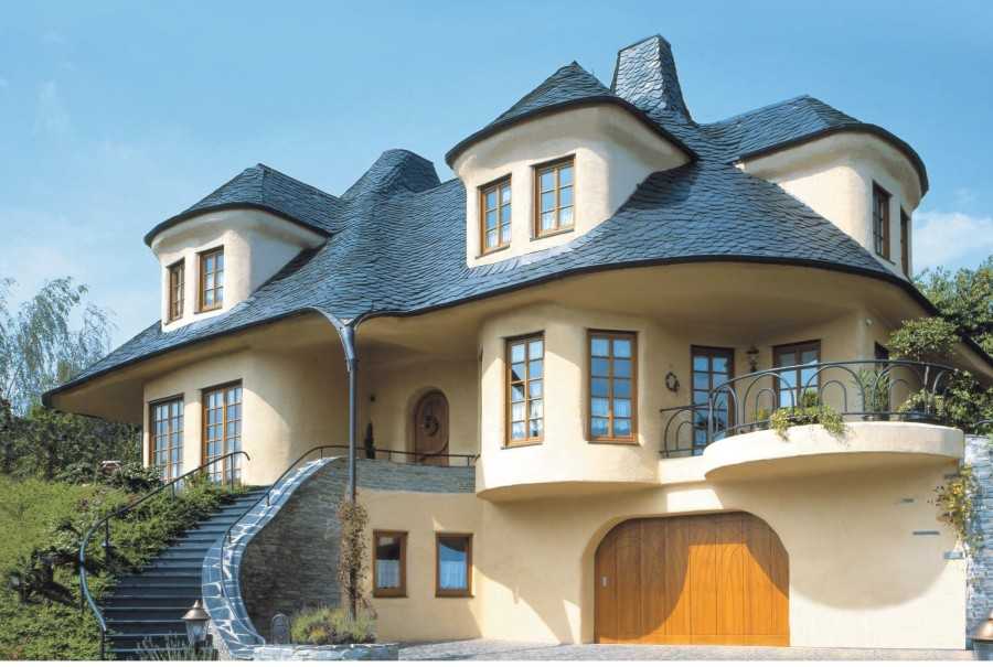 Дома с такими кровлями по дизайну максимально приближены к свободным природным очертаниям, и для создания кровельного настила используются полностью натуральные материалы – в первую очередь это сланец.