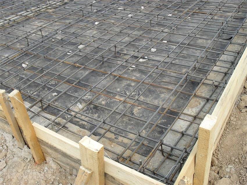 Арматурный каркас плиты вяжется из двух горизонтальных сеток. Сетку делают из продольных и поперечных прутов диаметром 12–16 мм, размер ячейки 15х15 см (для экономии 20х20 см).